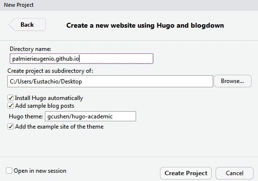 If you prefer to have different url names for your GitHub profile and Blog (not like my example: https://github.com/palmierieugenio and https://palmierieugenio.github.io), you can follow the note 4.↩